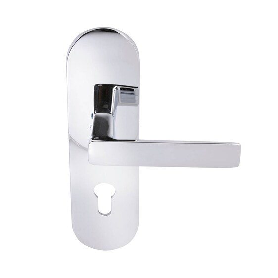 Durable brass-based handle, suitable for public places. The handle is equipped with a return spring. Available with multiple surface treatments. Available by special order as a custom surface according to RAL colors. The factory standard door thickness is 40mm-60mm, also available with other door thicknesses. The handle is available in several different types of plates depending of the door type and lock case.