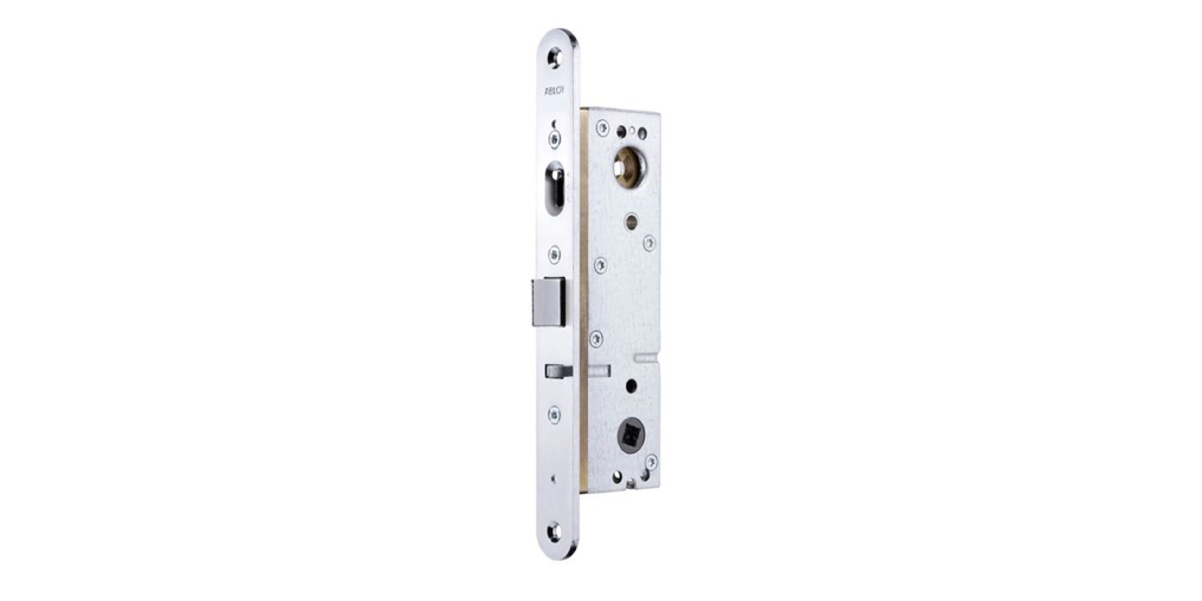 Exit lock case with automatic deadlocking latchbolt for profile doors with one leaf and active side on double doors.