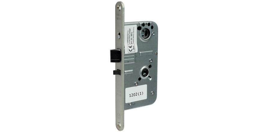 The door is opened from outside with a lever handle. The lock case fulfils the requirements of the European standard for exit products SFS-EN179 and SFS-EN1125 and the requirements of the lock case standard SFS-EN12209. The lock is always opened from the inside by a lever handle or panic bar. The latchbolt protrudes 14 mm. Deadlocking is controlled by a snib in the front plate. Using of the snib is normally blocked. The snib is released by turning the key. When the snib is in its up position, the lock will deadlock when the door closes and can only be opened by a key from the outside or by a lever handle, push pad, or panic bar from the inside. When the snib is in its down position, the lock can be also be opened by the exterior handle.