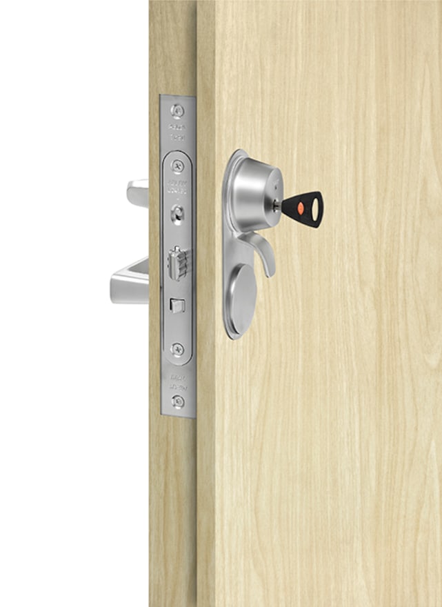 Pintalukon avainpesä. Lukko voidaan avata ulkopuolelta avaimella. Saatavana useilla eri pintakäsittelyvaihtoehdoilla.