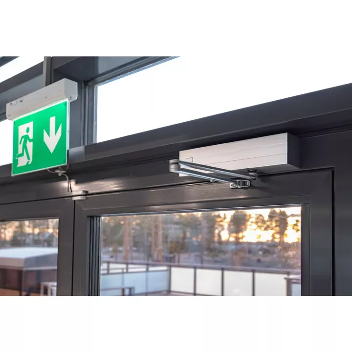 Dispositif indispensable à la réglementation CO46 des ERP, les fermes-portes Abloy assurent une haute résistance adaptée aux portes à trafic intensif verrouillées électriquement.